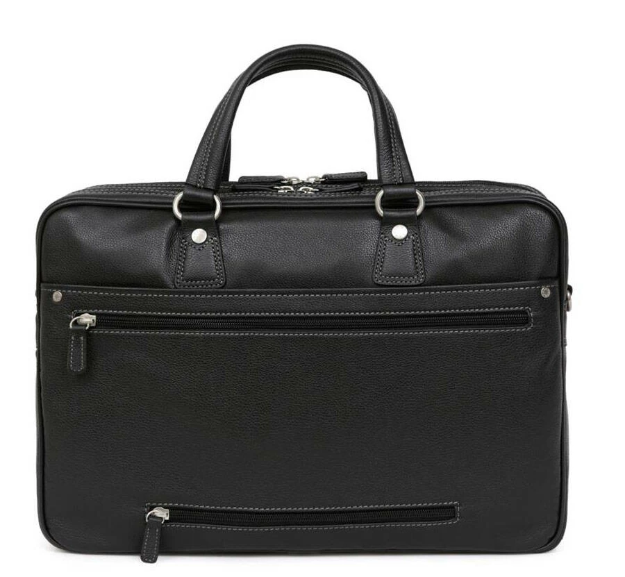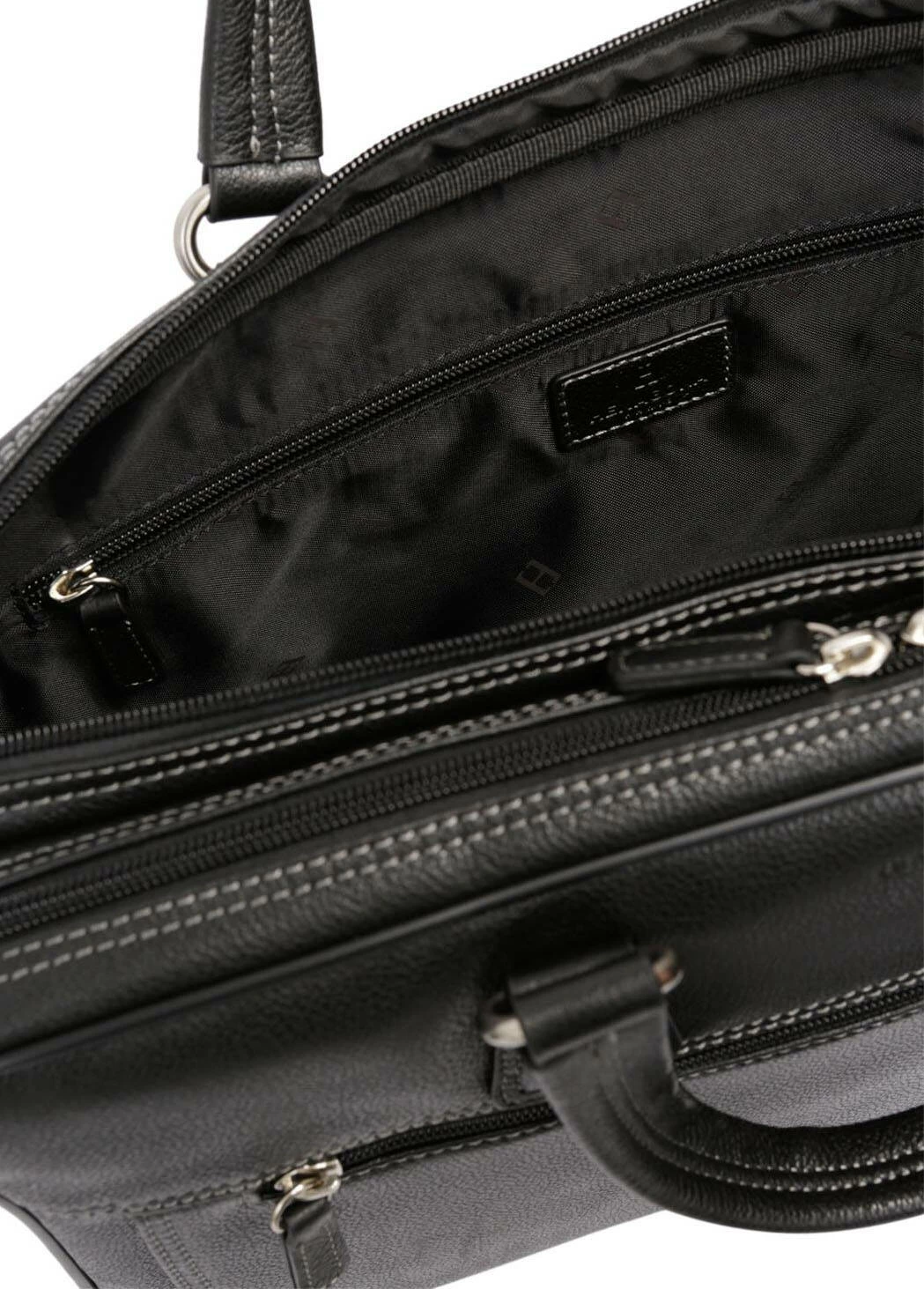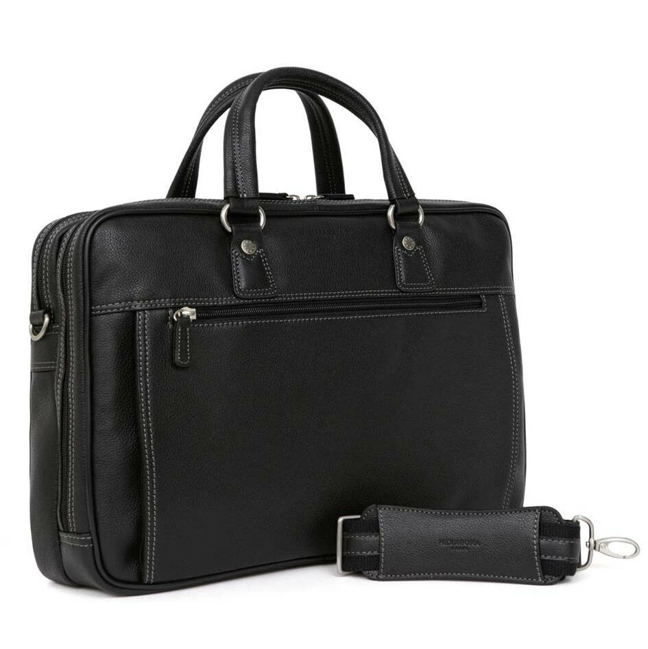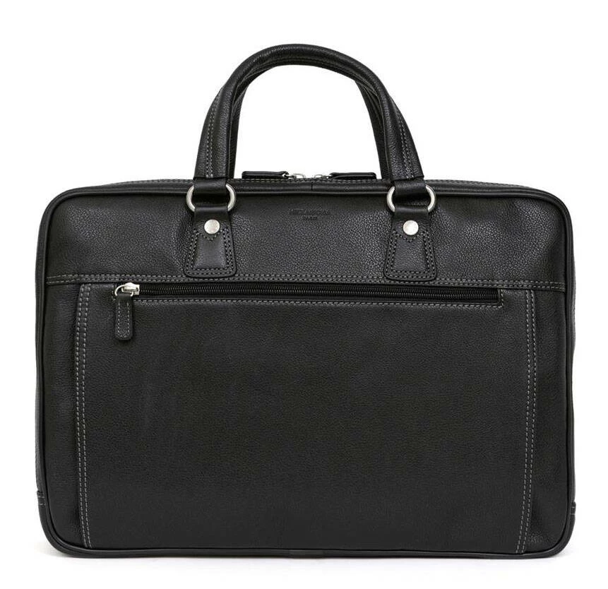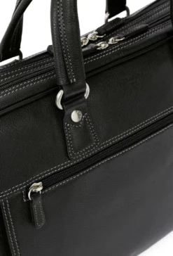 cartable en cuir de vachette grainé, elle est entièrement doublée, doublure Synthétique. Elle se ferme à l’aide d’un zip à double curseur, sa métallerie est de couleur argent. A l’intérieur, on retrouve 2 compartiments principaux avec 1 poche plate zippée + 5 poches plates (dont 1 compartiment téléphone) + 3 compartiments carte + 2 espaces stylo. Sur l’avant, vous avez 1 poche zippée et sur l’arrière 2 poches plates (dont 1 poche transformable en passage trolley). Ses dimensions sont compatible format A4, vous avez 2 poignées non réglables et une bandoulière en supplément amovible avec renfort d’épaule de 33 cm x 2 cm.