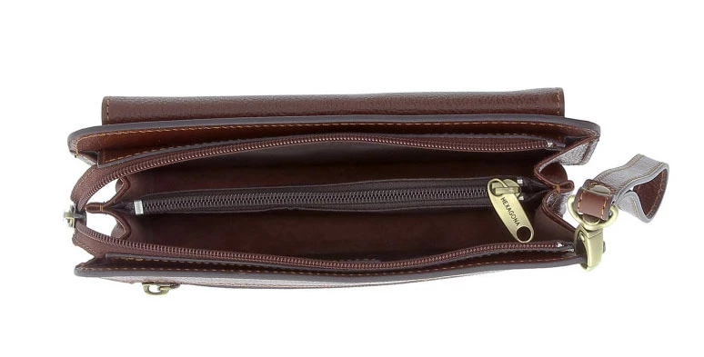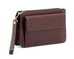 Pochette en cuir de vachette de la marque Hexagona . Elle se ferme à l’aide d’un zip, vous avez un poche à rabat sur l’avant et une petite poche zippée derrière. Vous avez une dragonne pour une meilleure prise en main . La pochette cuir possède 2 soufflets.