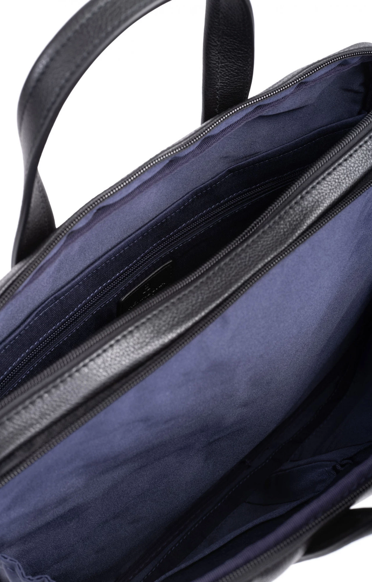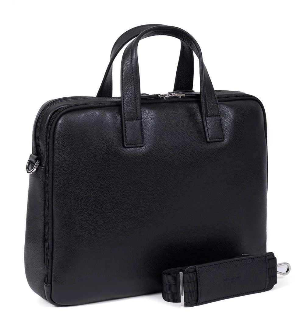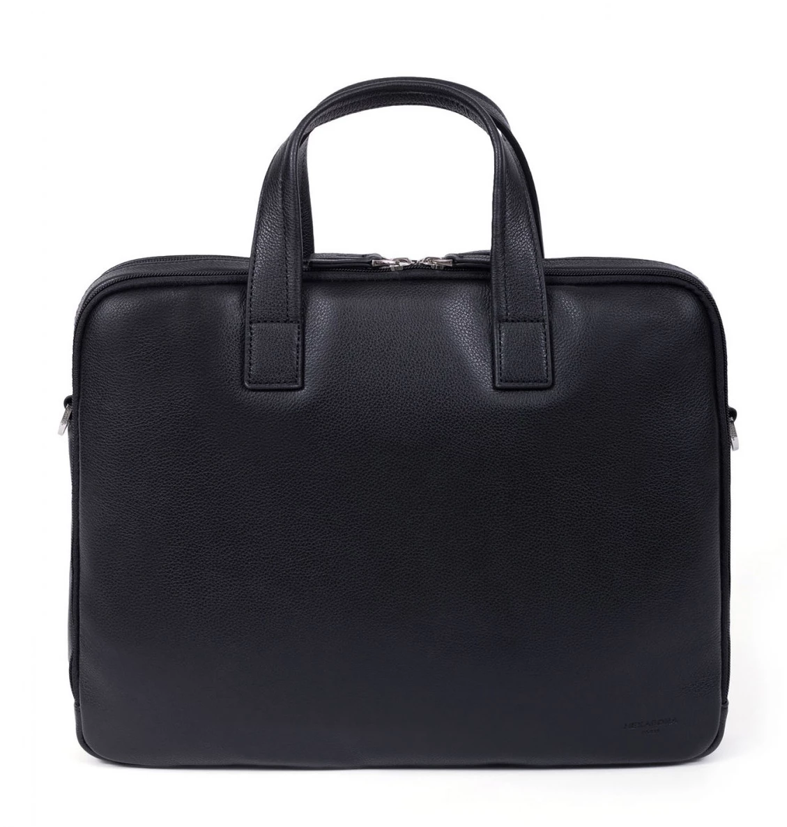 Porte documents 13″ et A4 en cuir de vachette grainé . Le sac se ferme à l’aide de fermetures à double curseur, il est entièrement doublé. Ses Finitions sont couleur argent brillant, ses poignées sont non réglables ( 35 cm) mais vous avez en ajout une bandoulière réglable et amovible avec renfort d’épaule ( 97 cm mini / 158 cm maxi ) . Son format est Compatible ordinateur portable et format A4, il possède deux grands compartiments principaux avec un compartiment ordinateur rembourré, une poche plate zippée, trois poches plates (dont un compartiment téléphone) et deux espaces stylo. A l’extérieur , il y a une poche plate zippée.