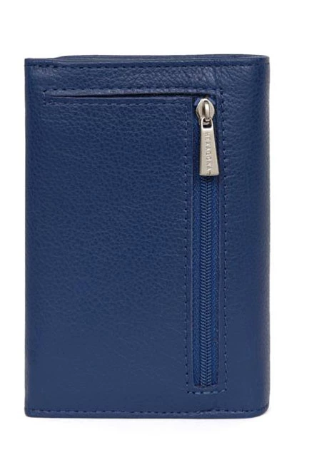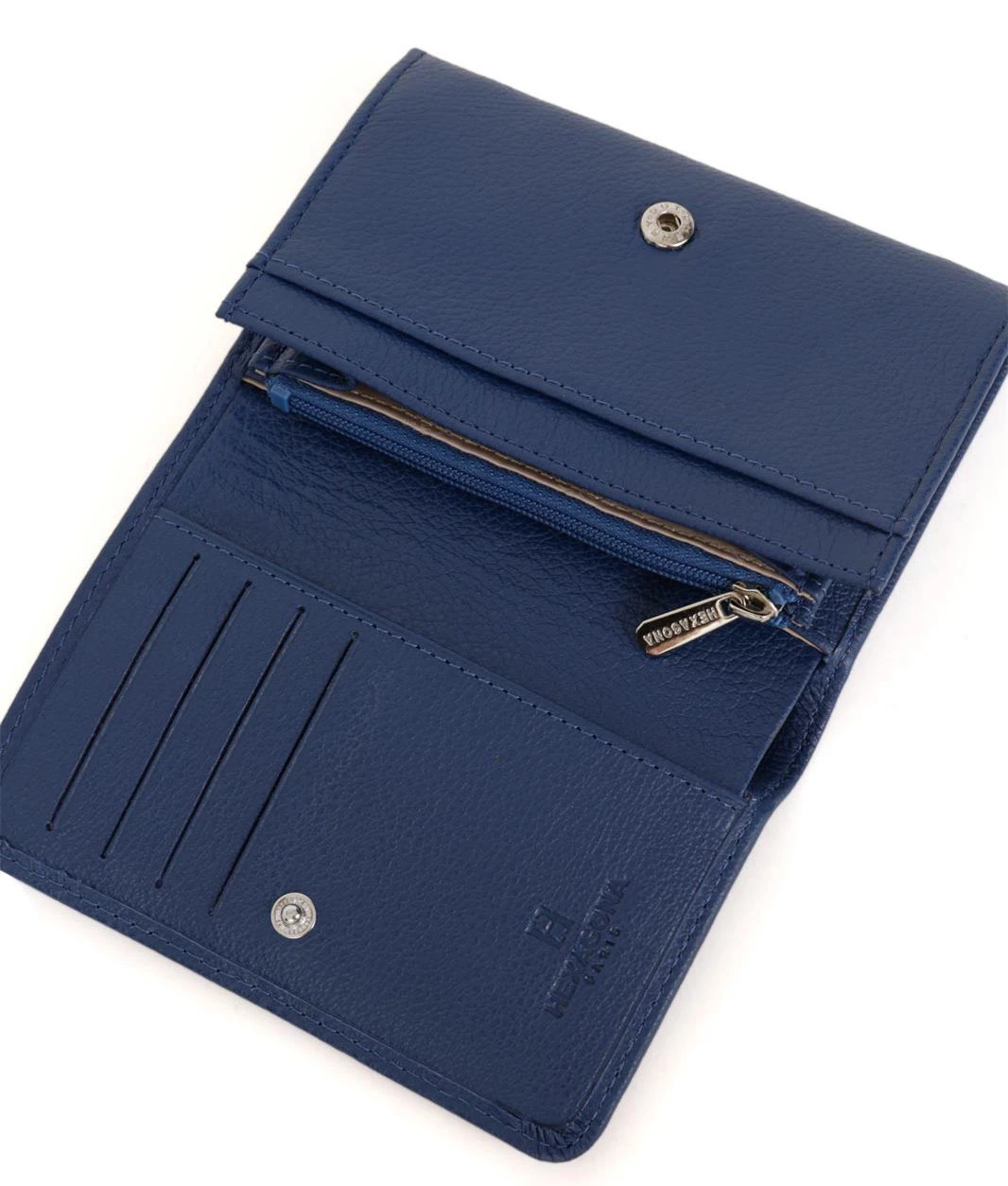 Portefeuille en cuir de vachette grainé de la marque Hexagona . IL possède une Fermeture à pression, il est Compatible cartes de crédit et CNI. A l’intérieur , on retrouve un volet, six poches plates (dont un zippée), un porte-monnaie zippé, une poche billets et huit emplacements carte.