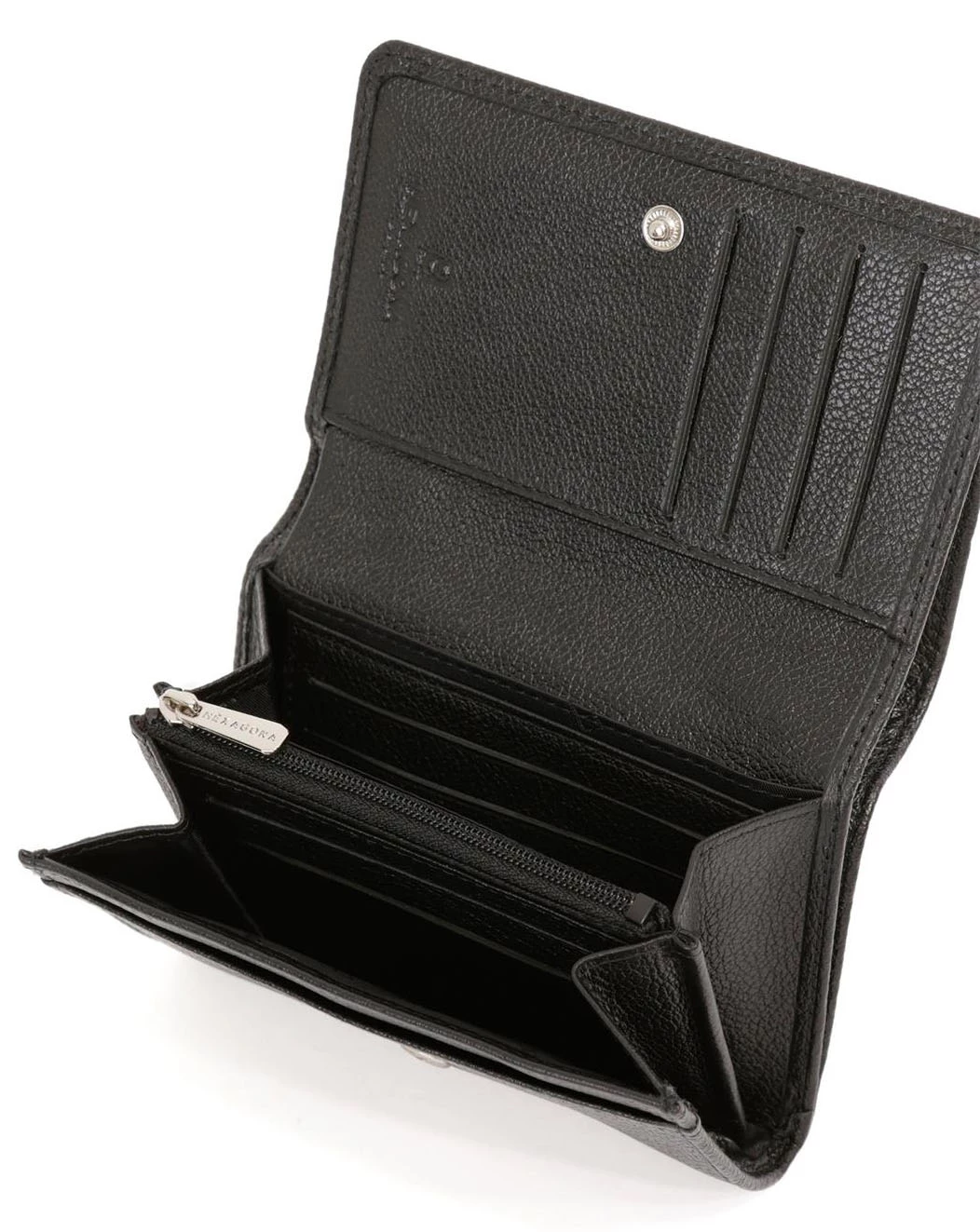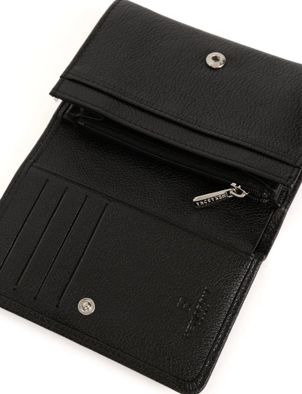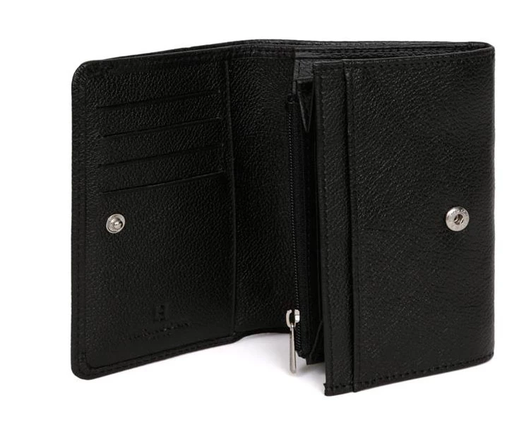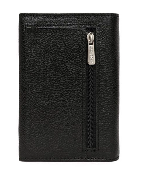 Portefeuille en cuir de vachette grainé de la marque Hexagona . IL possède une Fermeture à pression, il est Compatible cartes de crédit et CNI. A l’intérieur , on retrouve un volet, six poches plates (dont un zippée), un porte-monnaie zippé, une poche billets et huit emplacements carte.
