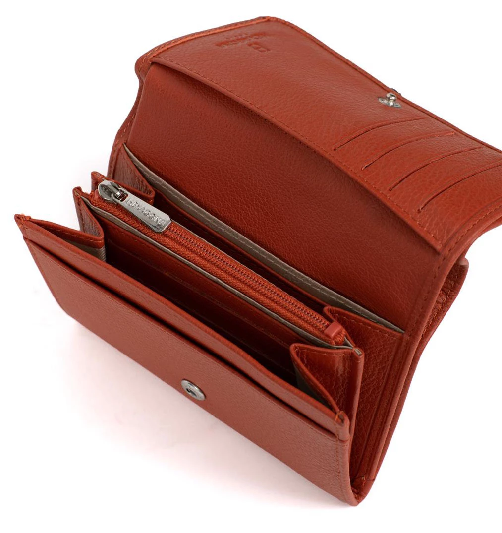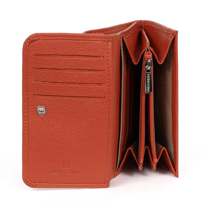 Portefeuille en cuir de vachette grainé de la marque Hexagona . IL possède une Fermeture à pression, il est Compatible cartes de crédit et CNI. A l’intérieur , on retrouve un volet, six poches plates (dont un zippée), un porte-monnaie zippé, une poche billets et huit emplacements carte.