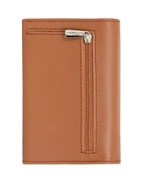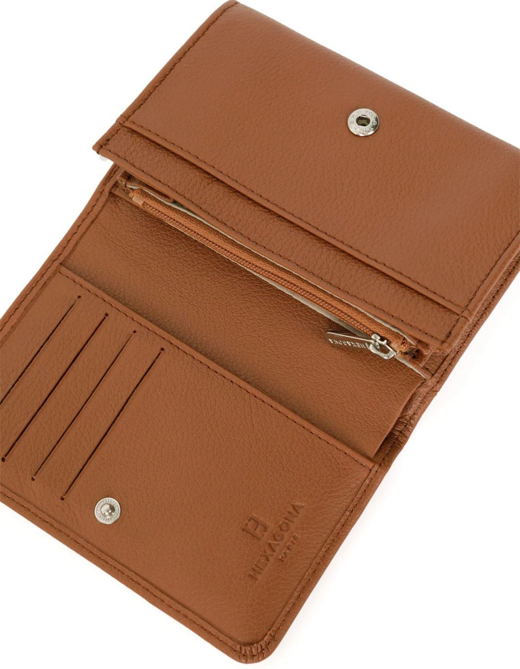 Portefeuille en cuir de vachette grainé de la marque Hexagona . IL possède une Fermeture à pression, il est Compatible cartes de crédit et CNI. A l’intérieur , on retrouve un volet, six poches plates (dont un zippée), un porte-monnaie zippé, une poche billets et huit emplacements carte.