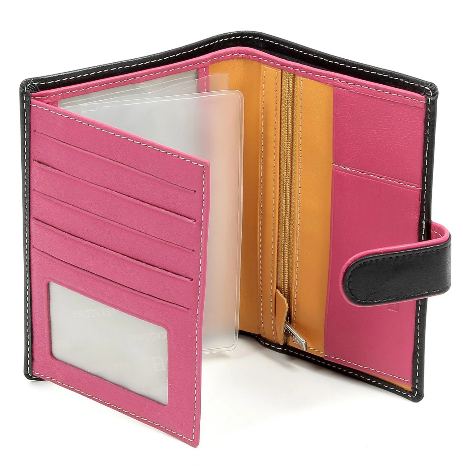 Portefeuille européen en cuir de vachette lisse . Vous avez une Fermeture patte à pression, Doublure : Synthétique, Finitions argent brillant. A l’Intérieur : deux volets, cinq poches plates (dont deux à vue transparente), un porte-monnaie zippé, une poche billets et cinq emplacements carte (dont un à vue transparente). Il est Compatible cartes de crédit, CNI, permis de conduire, passeport et carte grise .