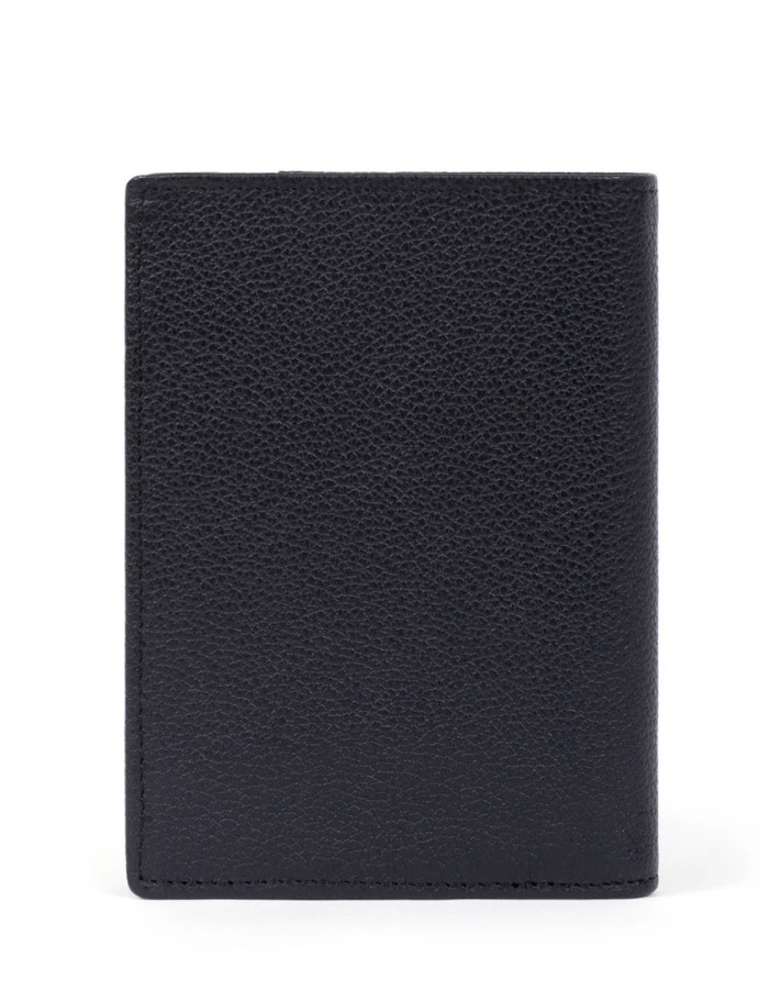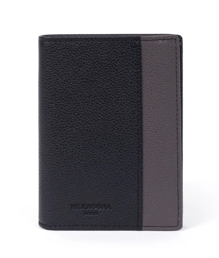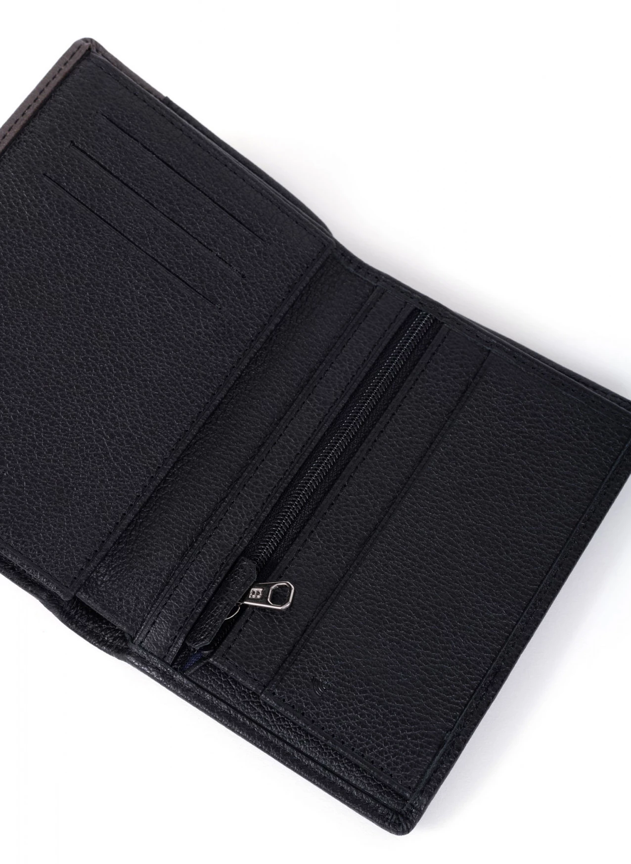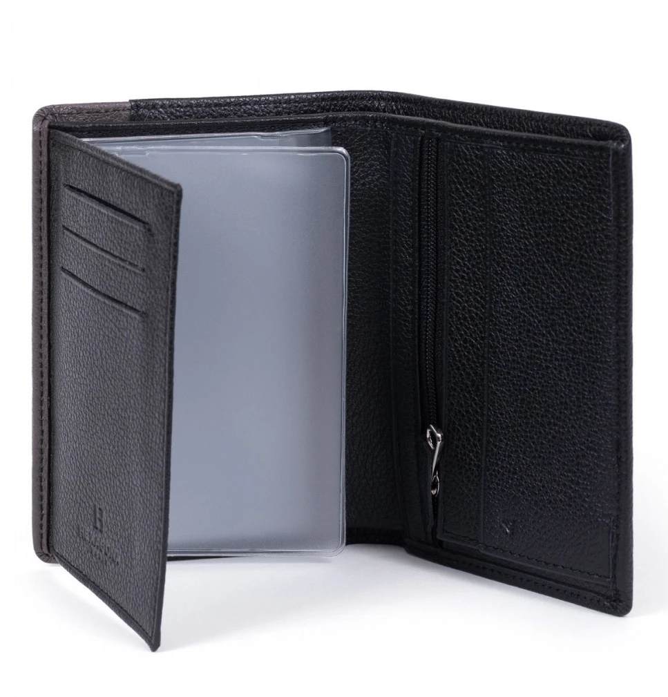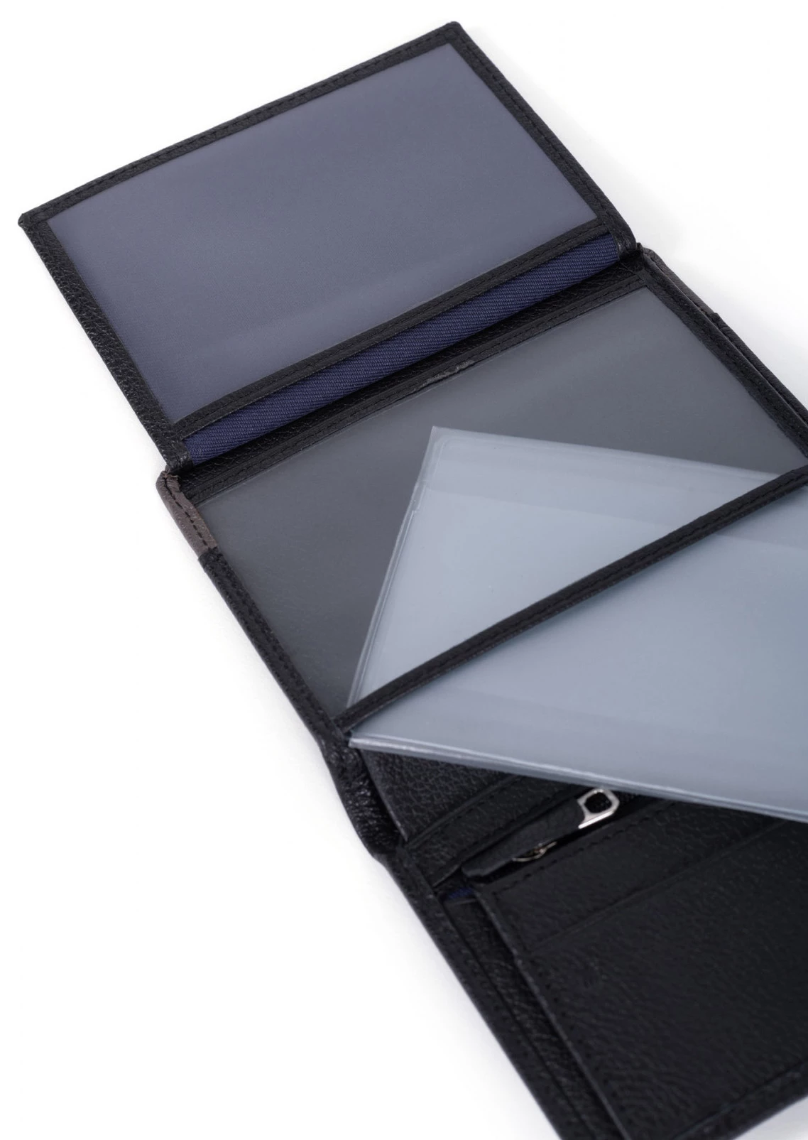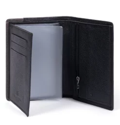 Portefeuille européen en cuir de vachette grainé, Doublure : Synthétique, Finitions argent brillant. A l’Intérieur : il y a Deux volets, quatre poches plates (dont deux à vue transparente), un porte-monnaie zippé, une poche billets et trois emplacements carte. Il est Compatible cartes de crédit, CNI et permis de conduire.