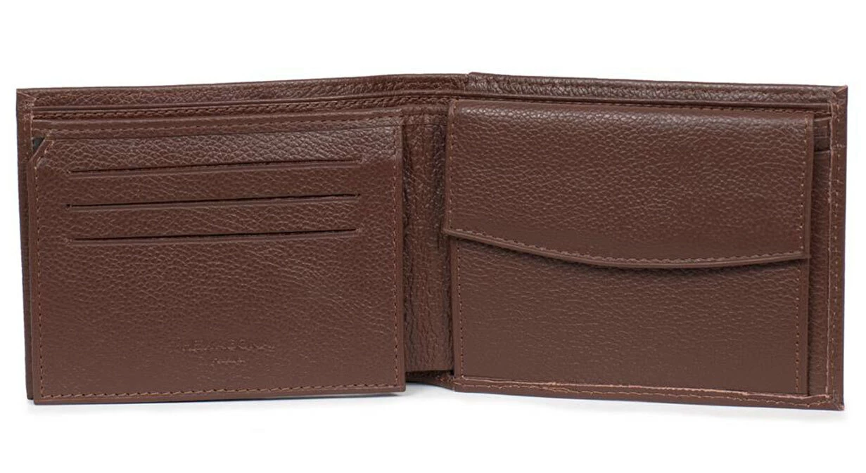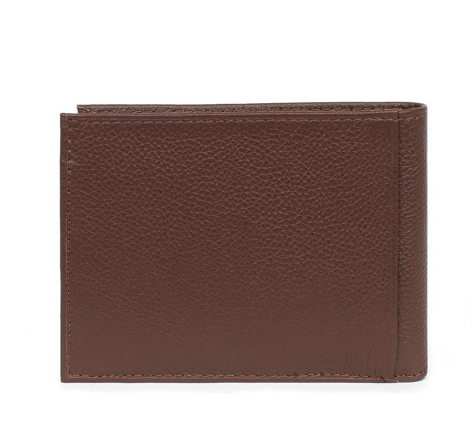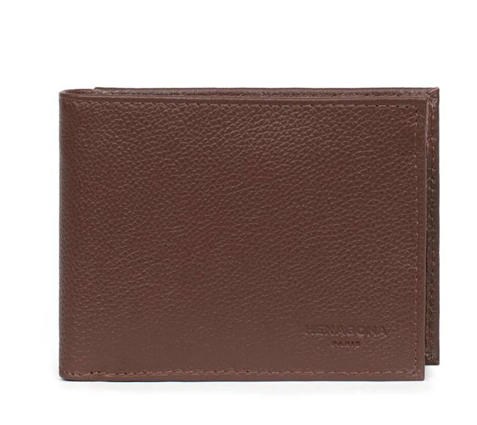 Portefeuille italien en cuir de vachette grainé, Doublure : Synthétique, Finitions argent brillant. L’Intérieur : deux volets, trois poches plates (dont deux à vue transparente), un porte-monnaie à rabat à pression, deux poches billets et trois emplacements carte. Il est Compatible cartes de crédit et CNI.