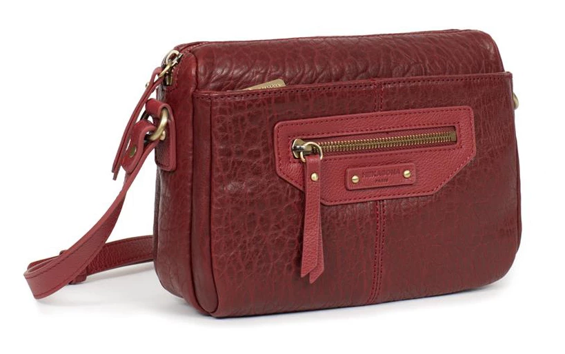 Sac à main en cuir de mouton garni de cuir de vachette grainé , ses dimensions :sont L 26 x H 16 x P 11 cm. Vous avez 3 compartiments tous sont fermés par un zip, 1 poche avant plate zippée, à l’intérieur 1 poche plate zippée et 1 compartiment téléphone . Sa bandoulière est réglable avec ses 9 crans , elle est non amovible (110 cm mini/135 cm maxi).