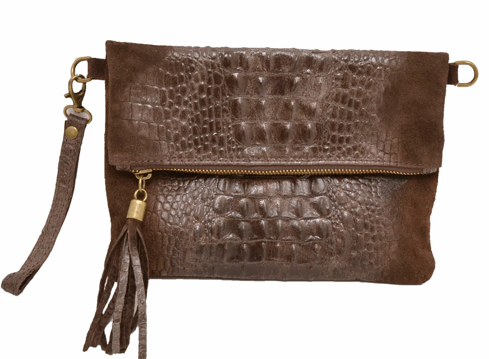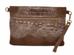 Petite pochette main en cuir de vachette pour femme. Pour plus d’originalité , le cuir est travaillé aspect cuir croco. Vous avez en ajout une bandoulière , vous pouvez ainsi la porter plus décontracté à l’épaule. Vous avez une fermeture zippée, une grande poche centrale.