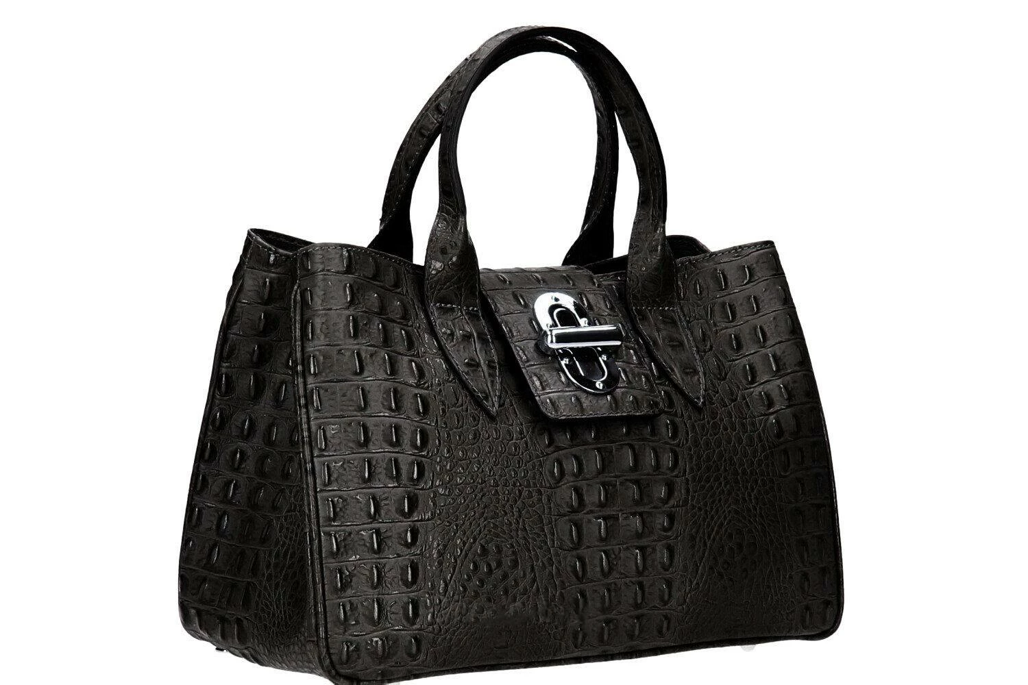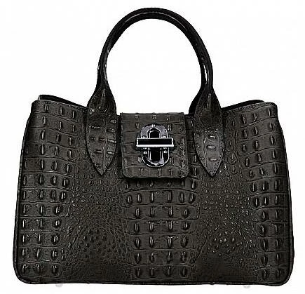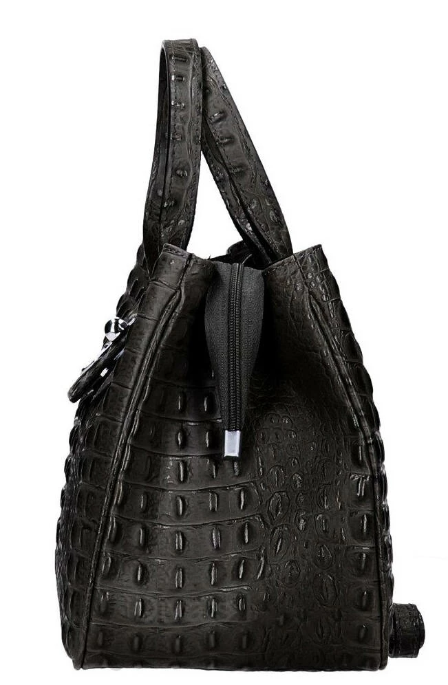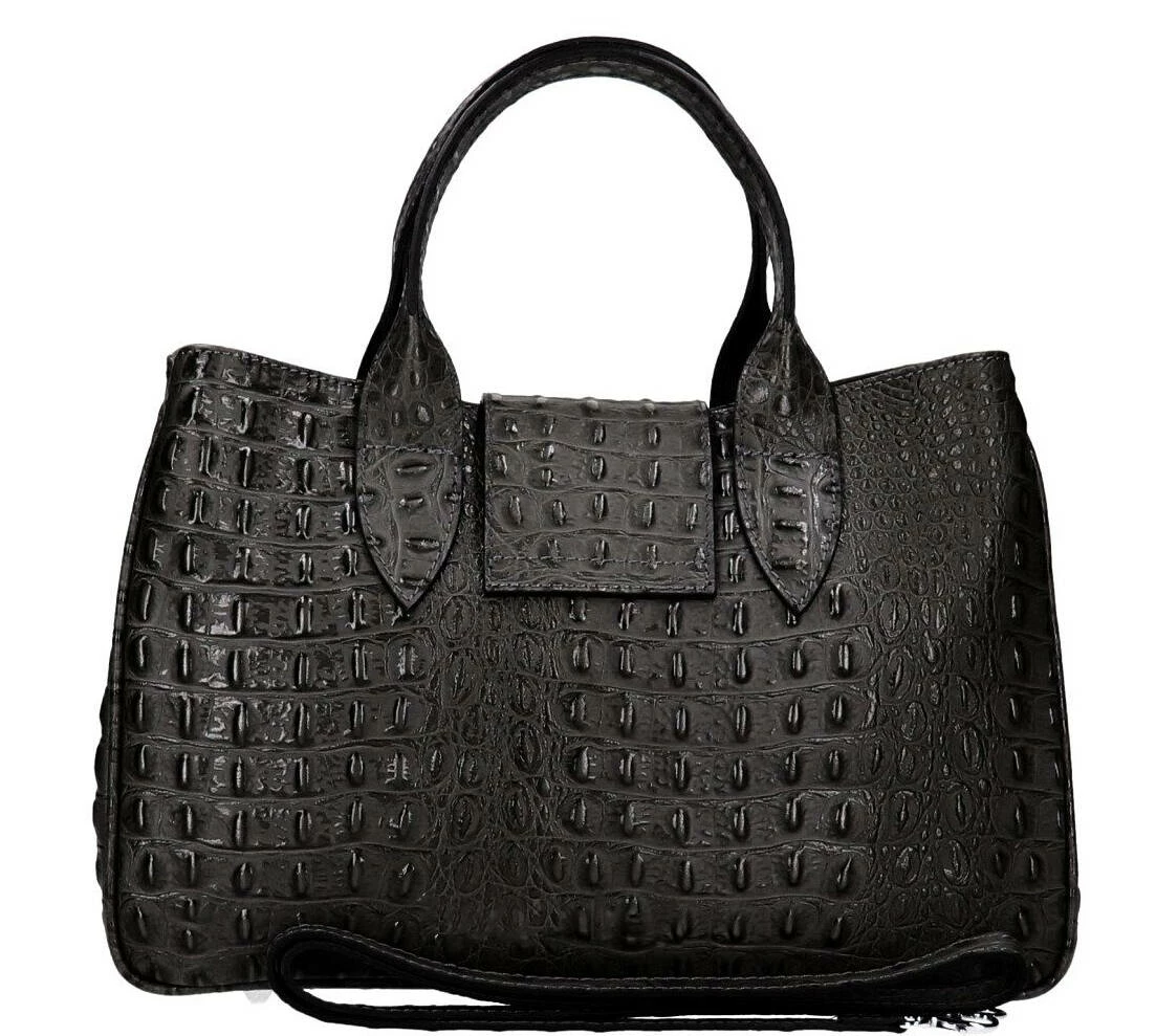 Sac à main en cuir véritable dans un look hors du commun avec son imprimé crocodile en cuir de veau véritable. Il possède une Fermeture éclair, ses accessoires sont en métal couleur nickel. Sa Structure est semi-rigide. A l’intérieur, on retrouve 1 poche pour téléphone portable, 1 Poche intérieure pour documents avec zip, 1 Compartiment double. Il est entièrement doublé en polyester. Sa bandoulière est amovible, comptez une hauteur de 24 pour une longueur de 36 cm et environ 17 cm de large.