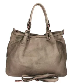 Maxi sac en cuir de vachette dans un coloris taupe . On aime son aspect patiné, vintage, plus moderne . De plus , le cuir est tressé sur le devant pour lui offrir plus d’originalité . Vous avez une bandoulière à l’intérieur , vous pouvez ainsi le porter soit à la main soit à l’épaule . Vous avez plusieurs poches et séparations, qui vous offrent de nombreux rangements .