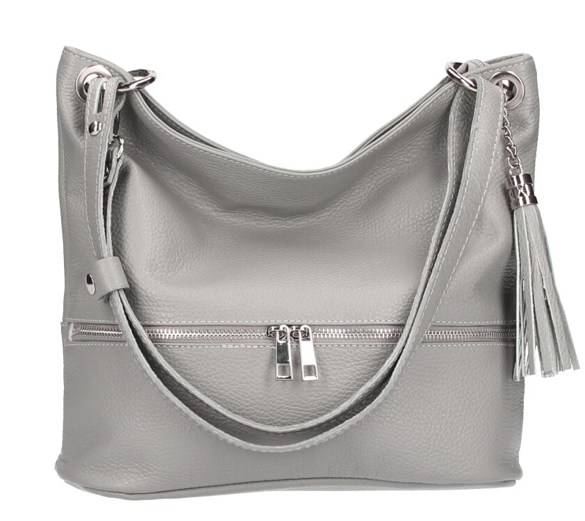 Sac à main en cuir de vachette aspect grainé , chic et sport. Ce sac en cuir se ferme à l’aide d’un zip, à l’intérieur, vous avez une poche de séparation zippée, deux grands compartiments, une petite poche zippée et deux petites poches ( portable, clefs , etc ) . La doublure est en polyester, les accessoires couleur nickel. Sur le dessus , on aime la fantaisie apporté avec ses zips, la petite chaine avec le bout de cuir à franges.